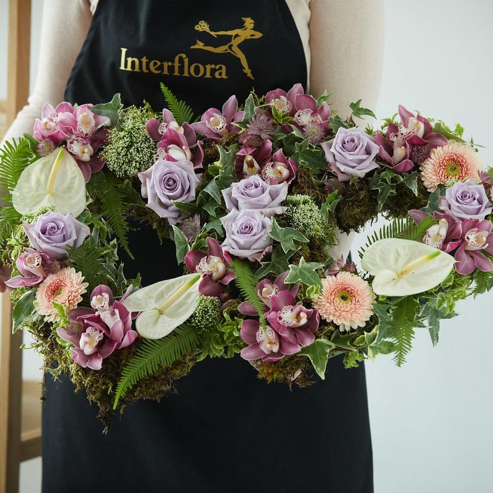 Two beautiful hearts with an open design, each features the finest orchids, anthuriums, and delicate lilac roses nestled in fresh foliage.