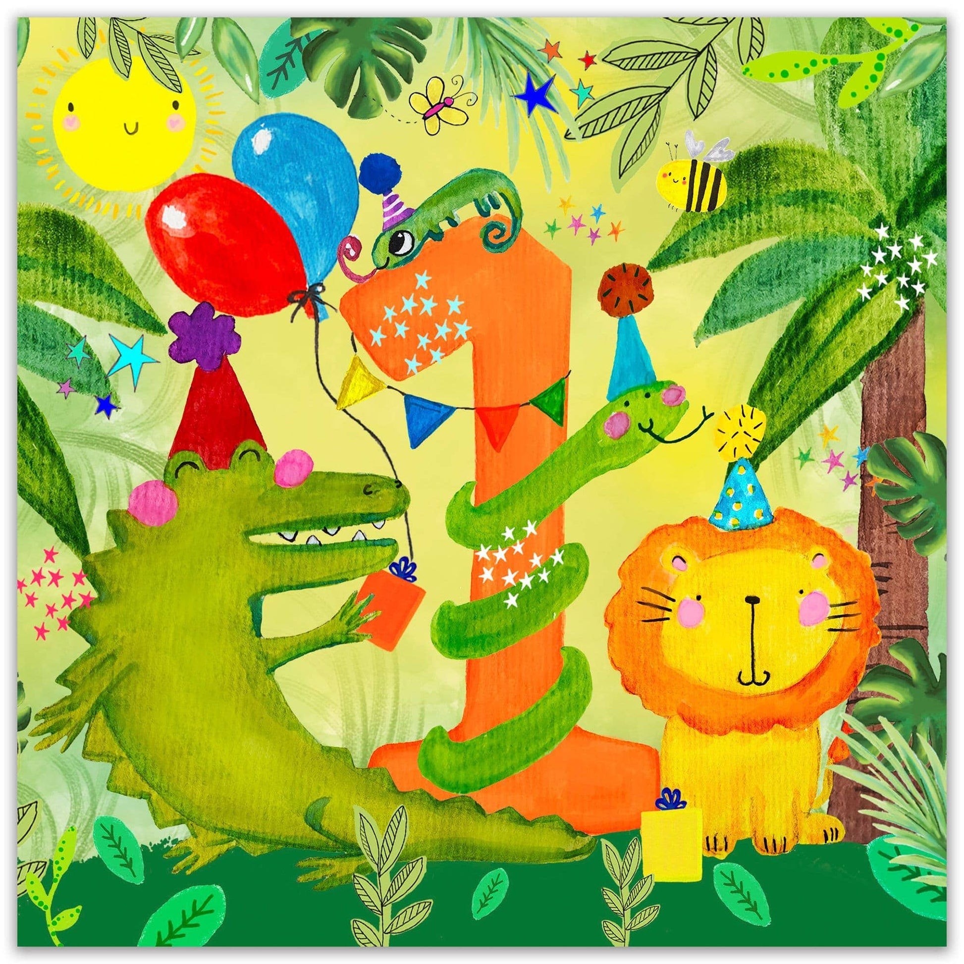 Beautiful and brightly painted jungle-themed age 1 boy's birthday card. Wild animals hold a party, perfect for that so special boy's first birthday. SIZE : This card measures 15.5cm x 15.5cm square and is printed on high quality card stock. PACKAGING : All cards are by default individually cello wrapped. We do offer ‘naked’ cards – please let us know when ordering if you would prefer this. ENVELOPE : This card comes with a high quality coloured envelope. DISPATCH : We dispatch orders within 1 working day. We have a low carriage paid order of just £100.00 for UK customers – that’s just 17 designs across our portfolio of nearly 900 cards! So why not trial us in your store. UK : All Twizler cards are designed, printed and manufactured exclusively in the UK.