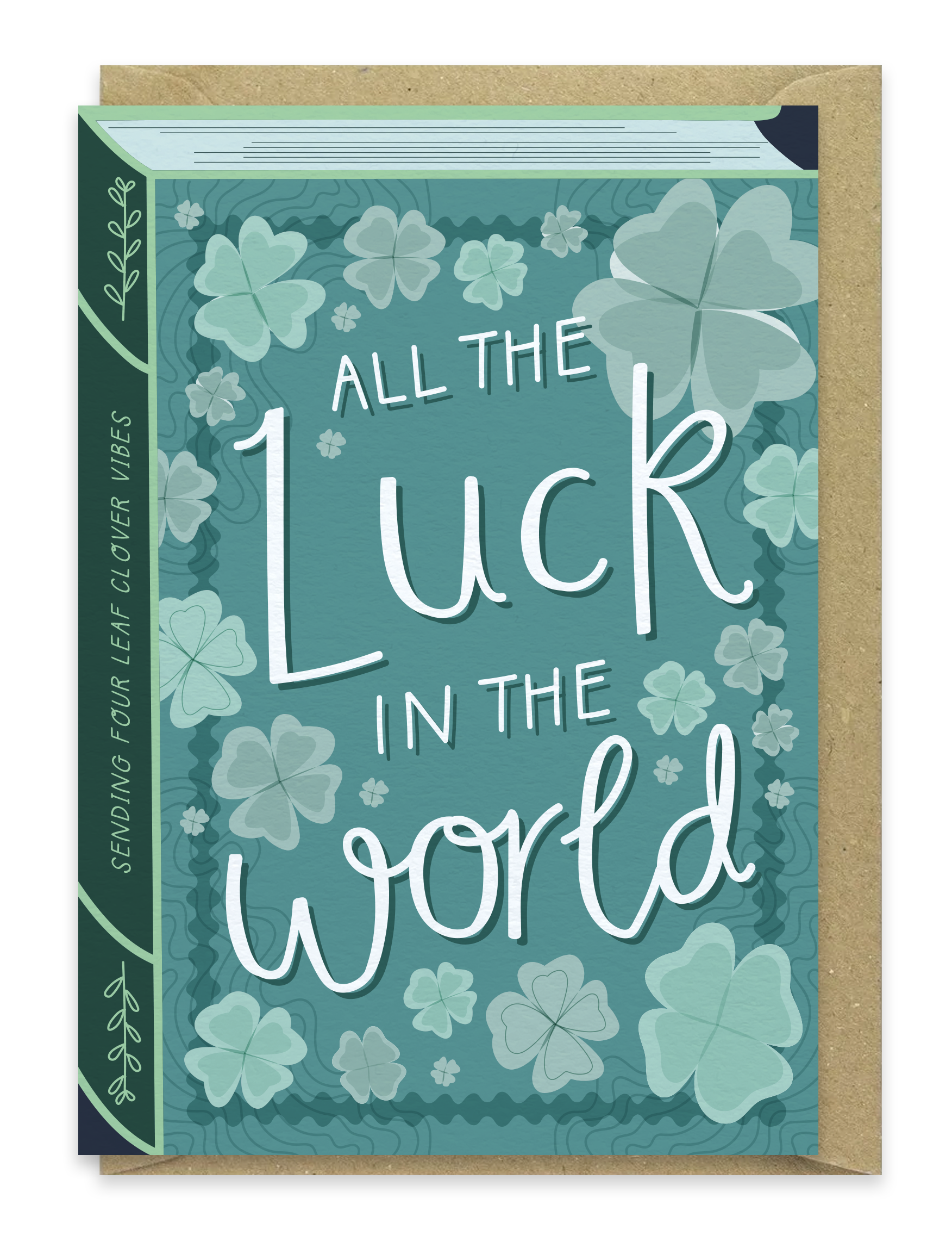 Inspired by the beauty of classic book covers, this book style greeting card features a bookish greeting ‘All the Luck in the World’ with lots of four-leaf clovers scattered around. It is designed in a beautiful teal green colour palette. It is gender neutral in design, and the spine reads ‘Sending Four Leaf Clover Vibes’ for an added Bookish touch.