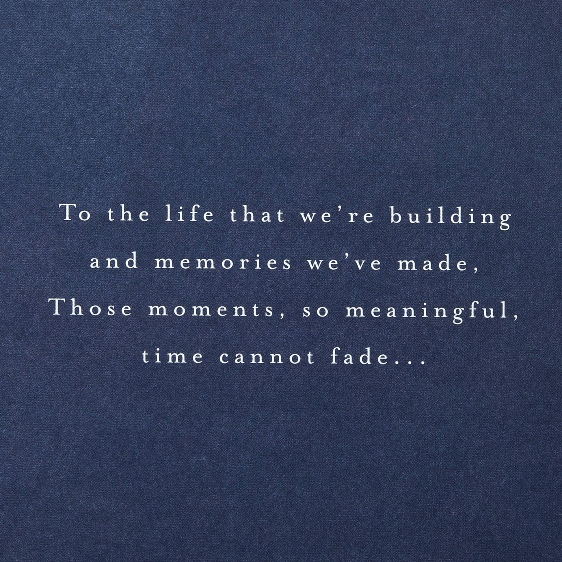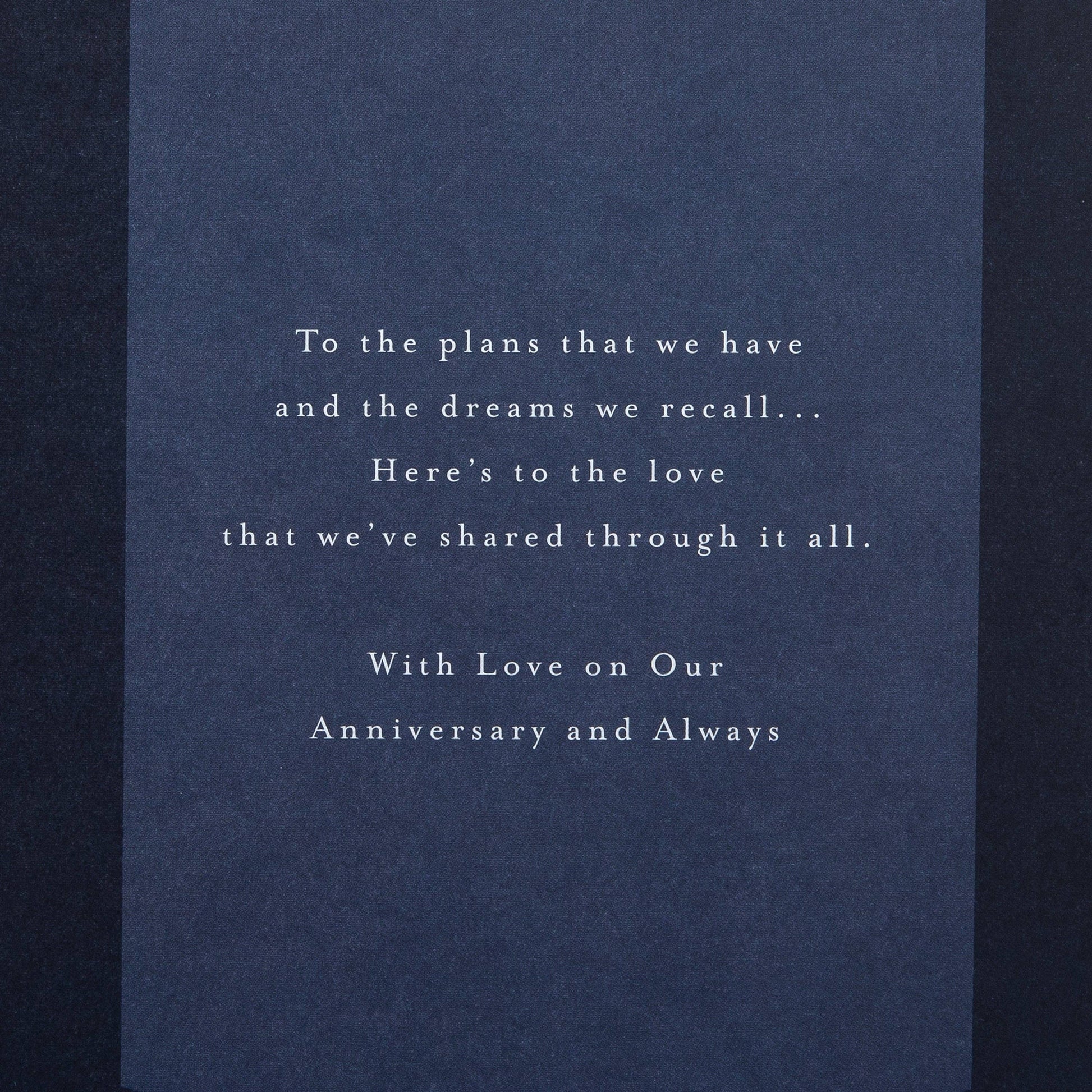 Message inside: To the life that we're building and memories we've made, those moments, so meaningful, time cannot fade… To the plans that we have and the dreams we recall... Here's to the love that we've shared through it all. With Love on Our Anniversary and Always