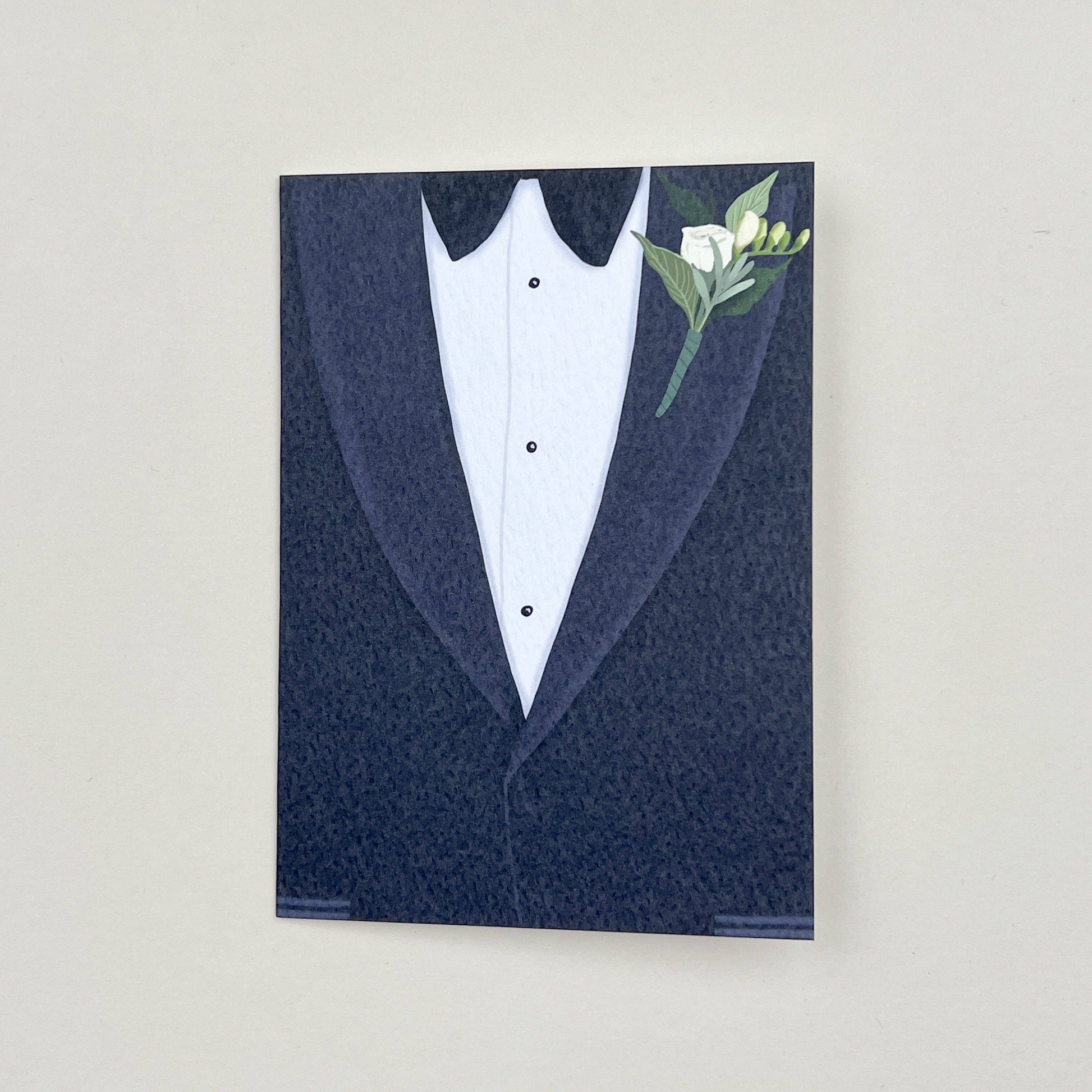 Exude sophistication on your wedding day with our 'Tuxedo Wedding Suit' greeting card. This card features a classic tuxedo design, perfect for the groom or groomsmen. Measuring 148x105mm, it includes a premium white envelope with a refined, tactile finish, delivering your warmest wishes with elegance.