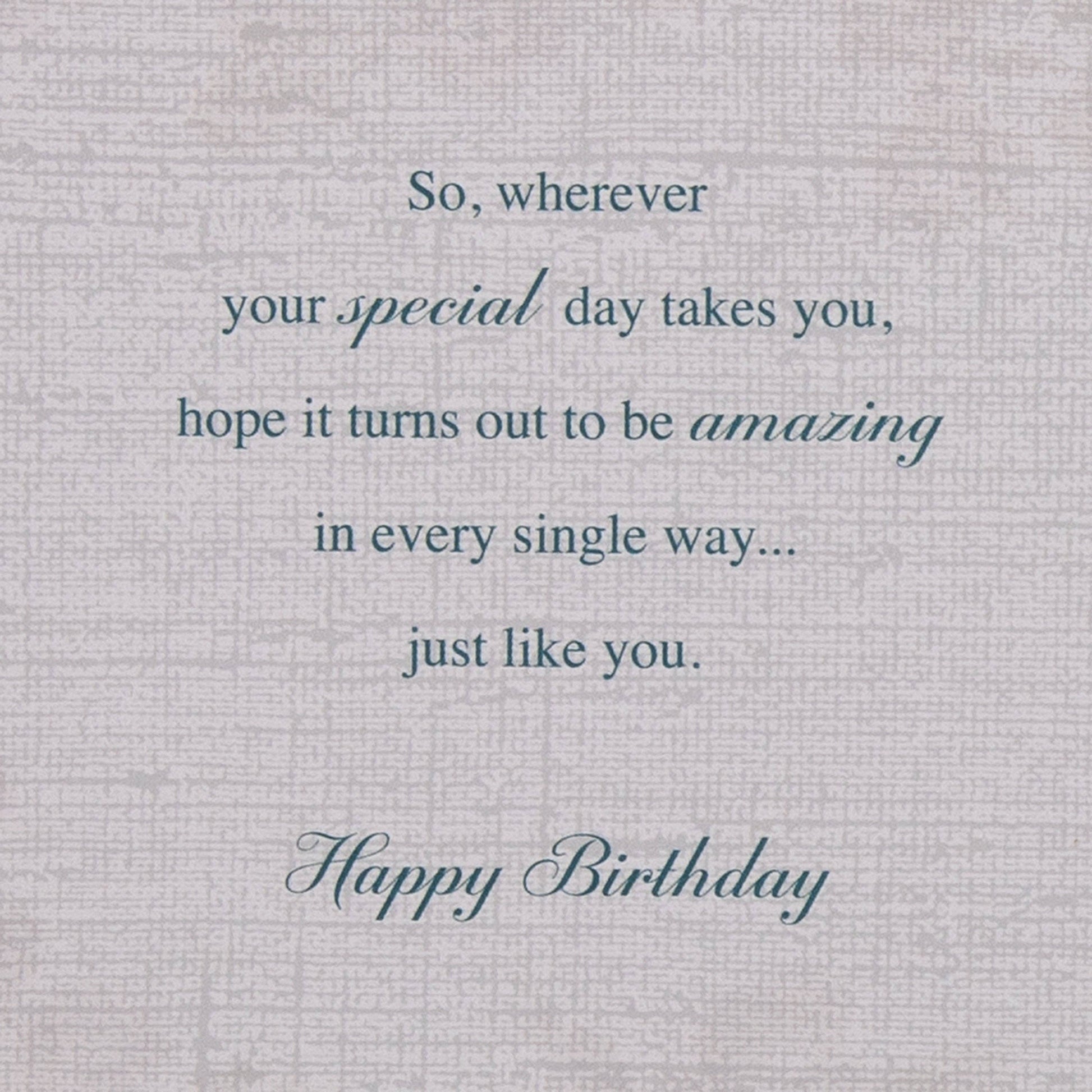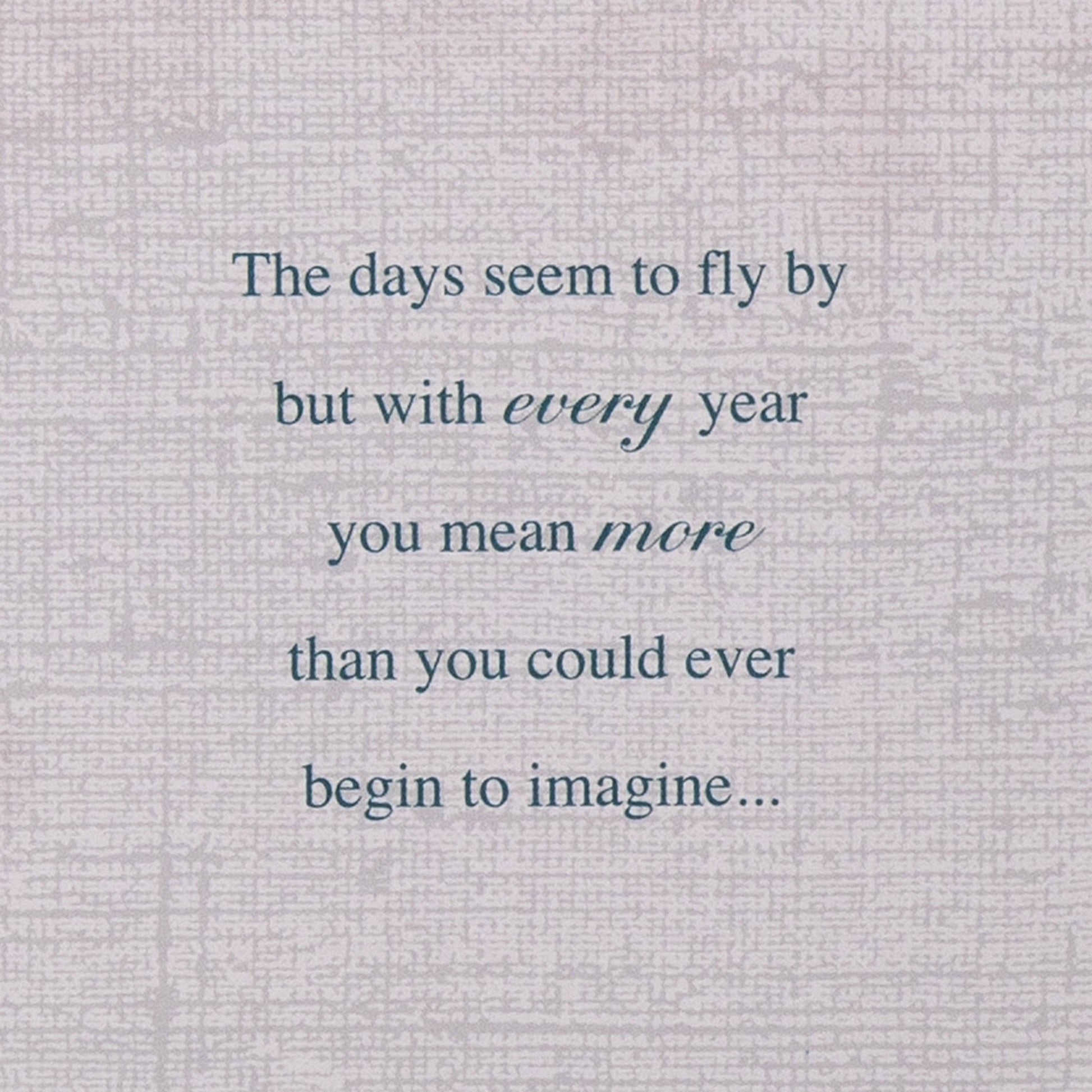 Message Inside Reads: The days seem to fly by but with every year you mean more than you could ever begin to imagine… So, wherever your special day takes you, hope it turns out to be amazing in every single way... just like you. Happy Birthday
