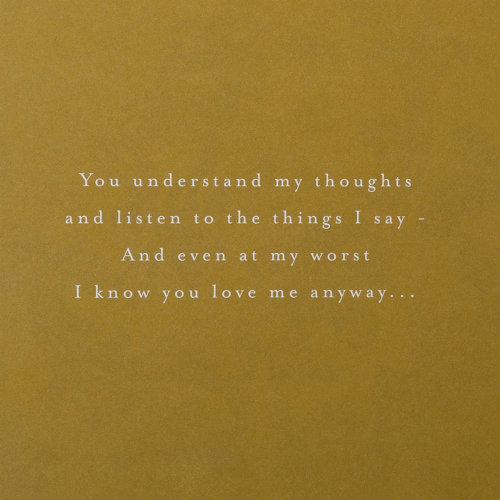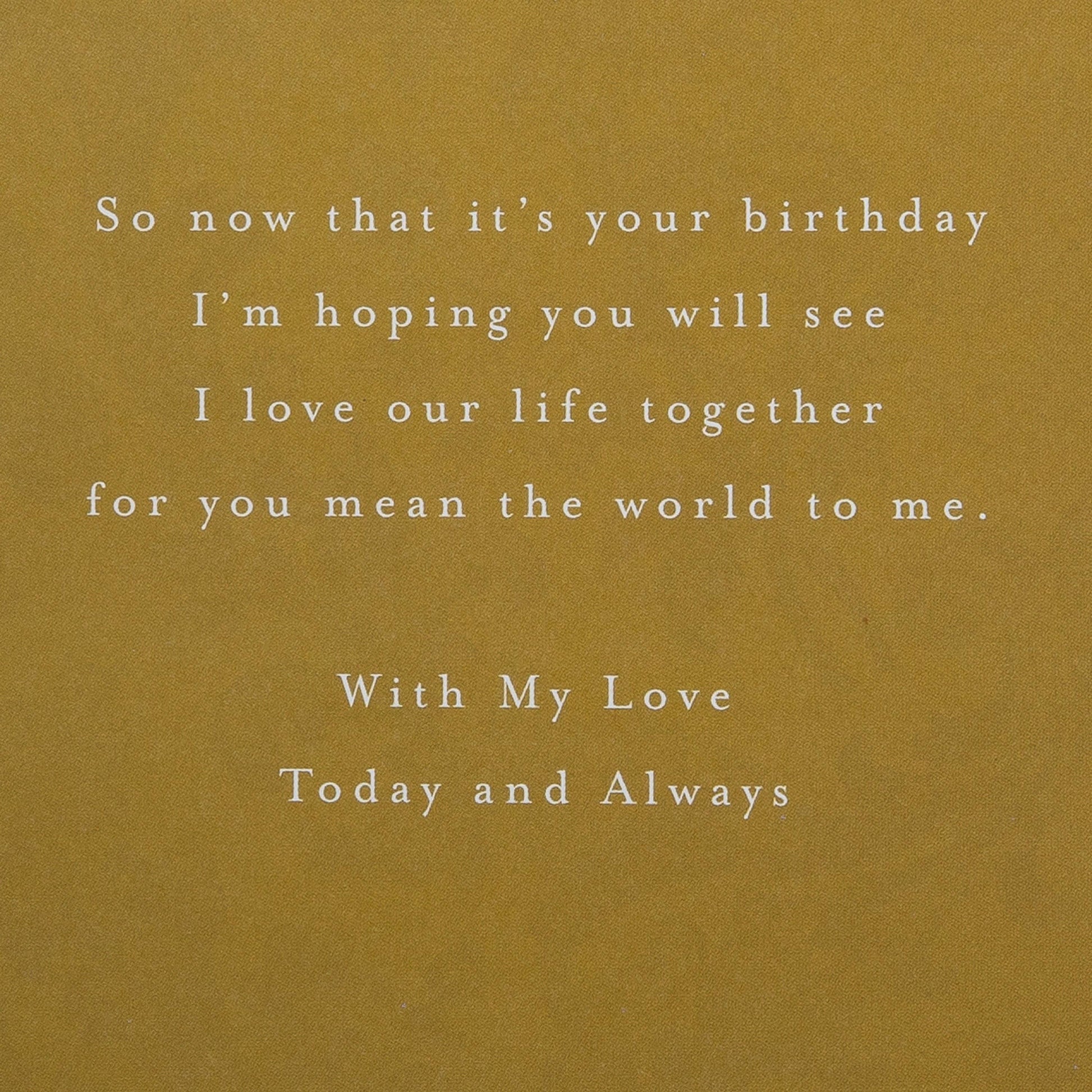 Message inside : You understand my thoughts and listen to the things I say - and even at my worst I know you love me anyway… So now that it's your birthday I'm hoping you will see I love our life together for you mean the world to me. With My Love Today and Always