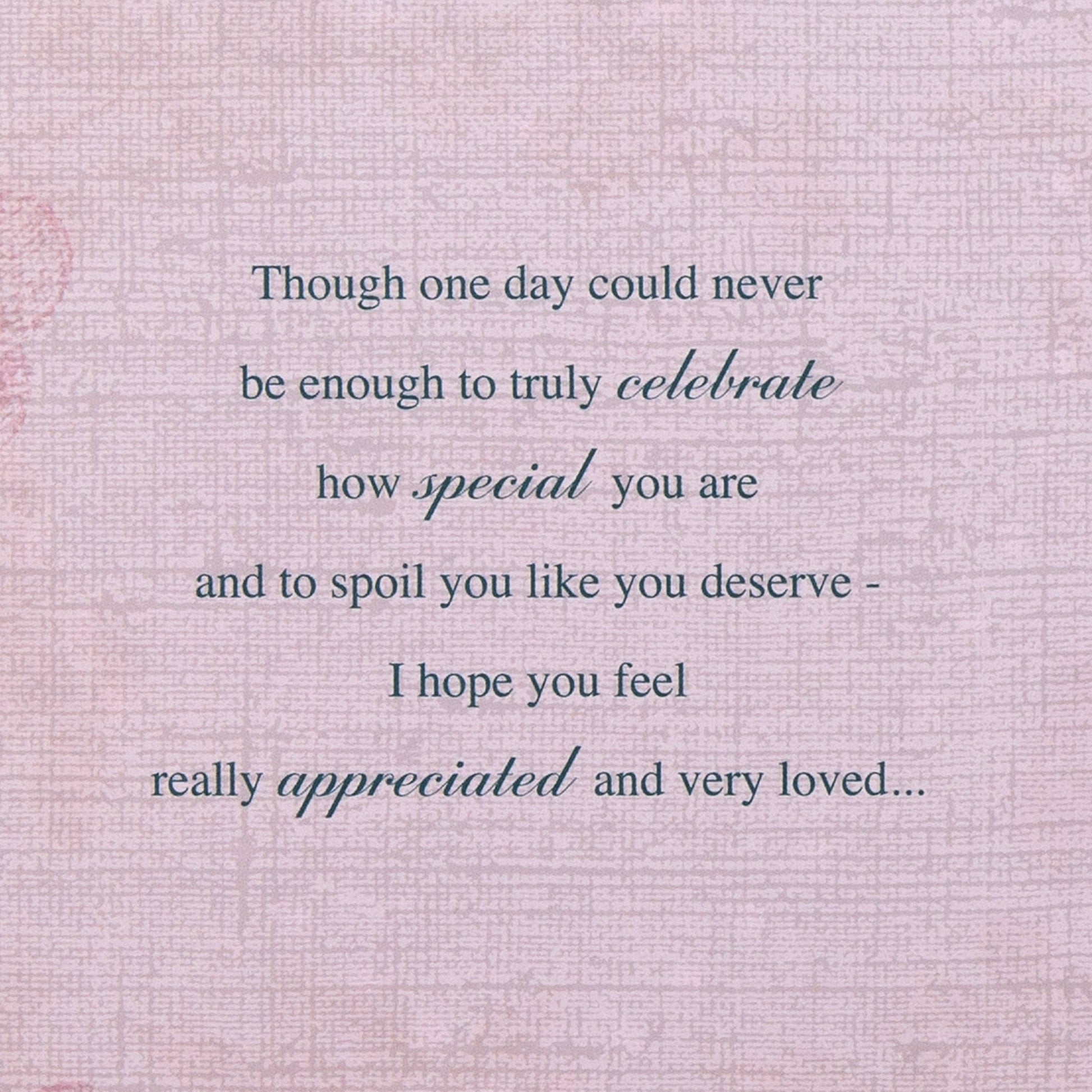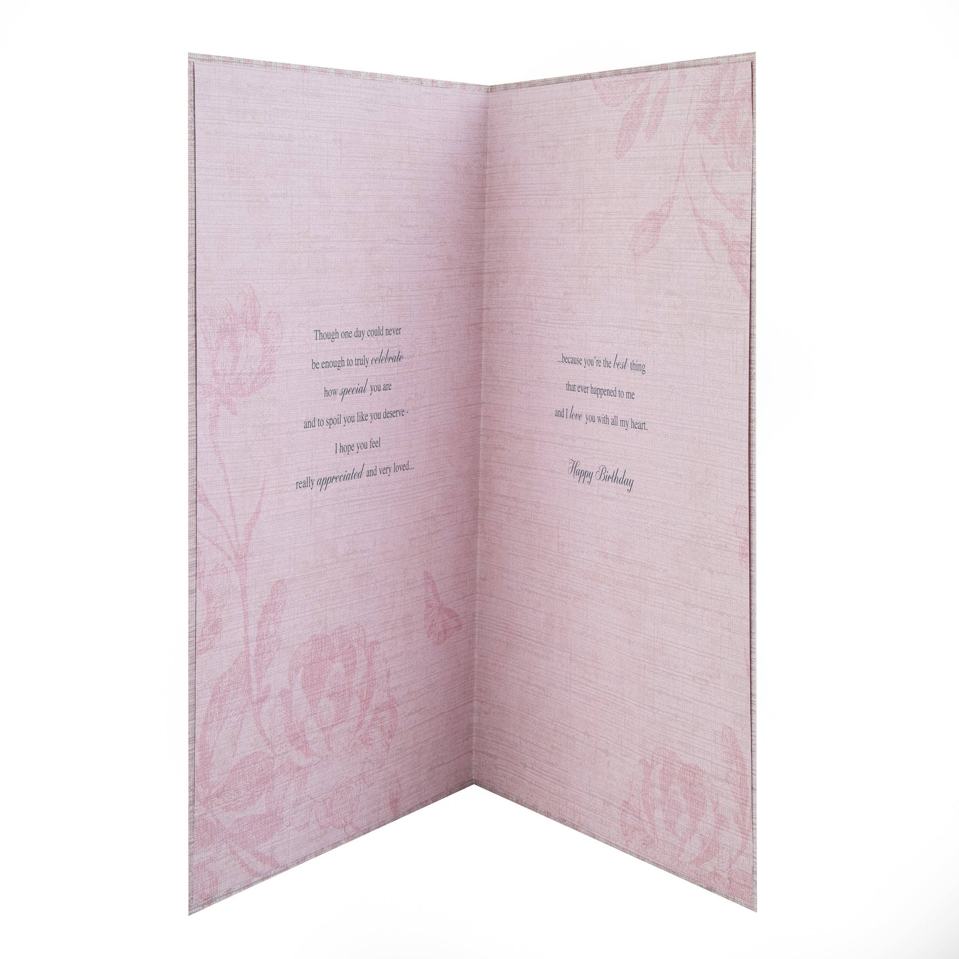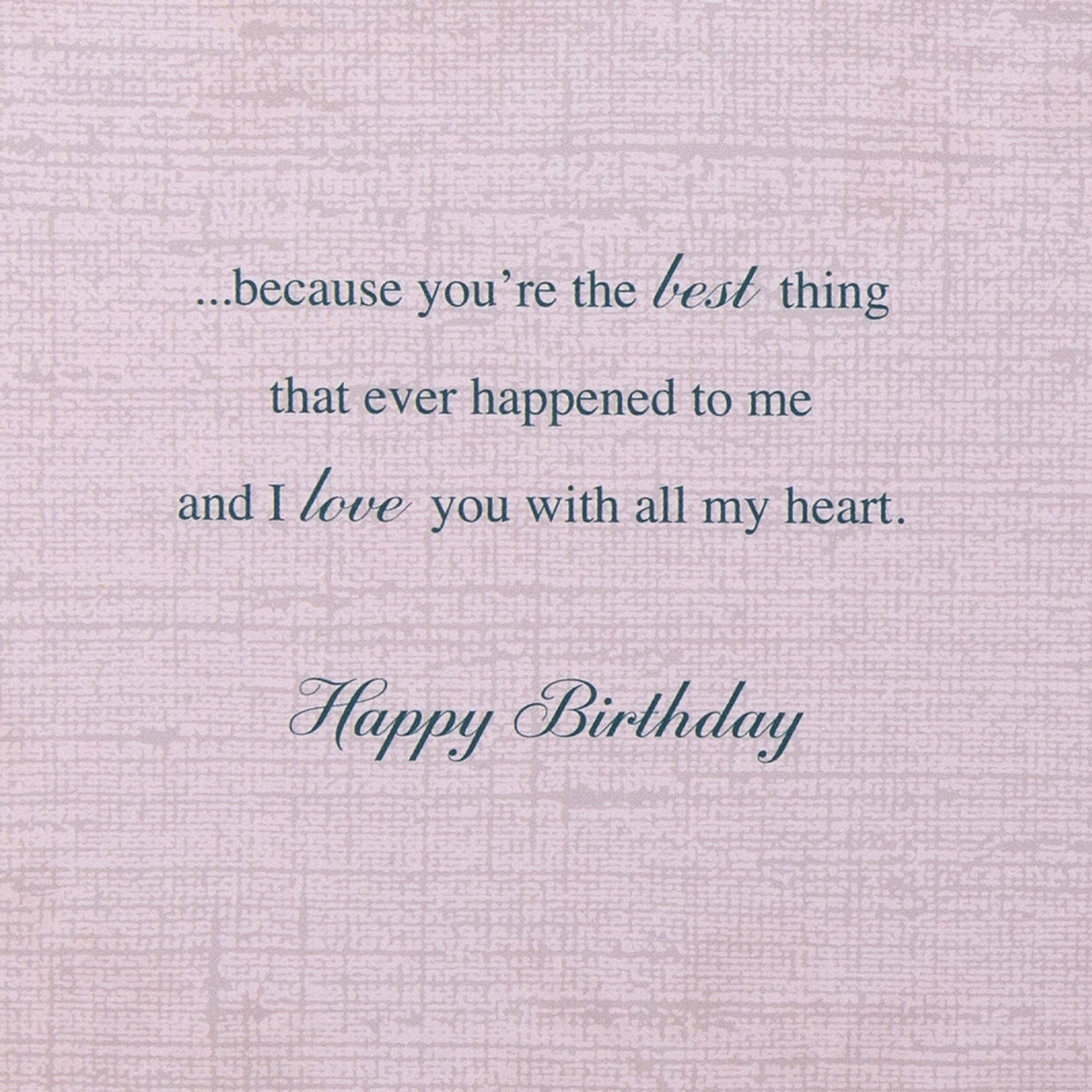 Message Inside Reads: Though one day could never be enough to truly celebrate how special you are and to spoil you like you deserve - I hope you feel really appreciated and very loved… ...because you're the best thing that ever happened to me and I love you with all my heart. Happy Birthday