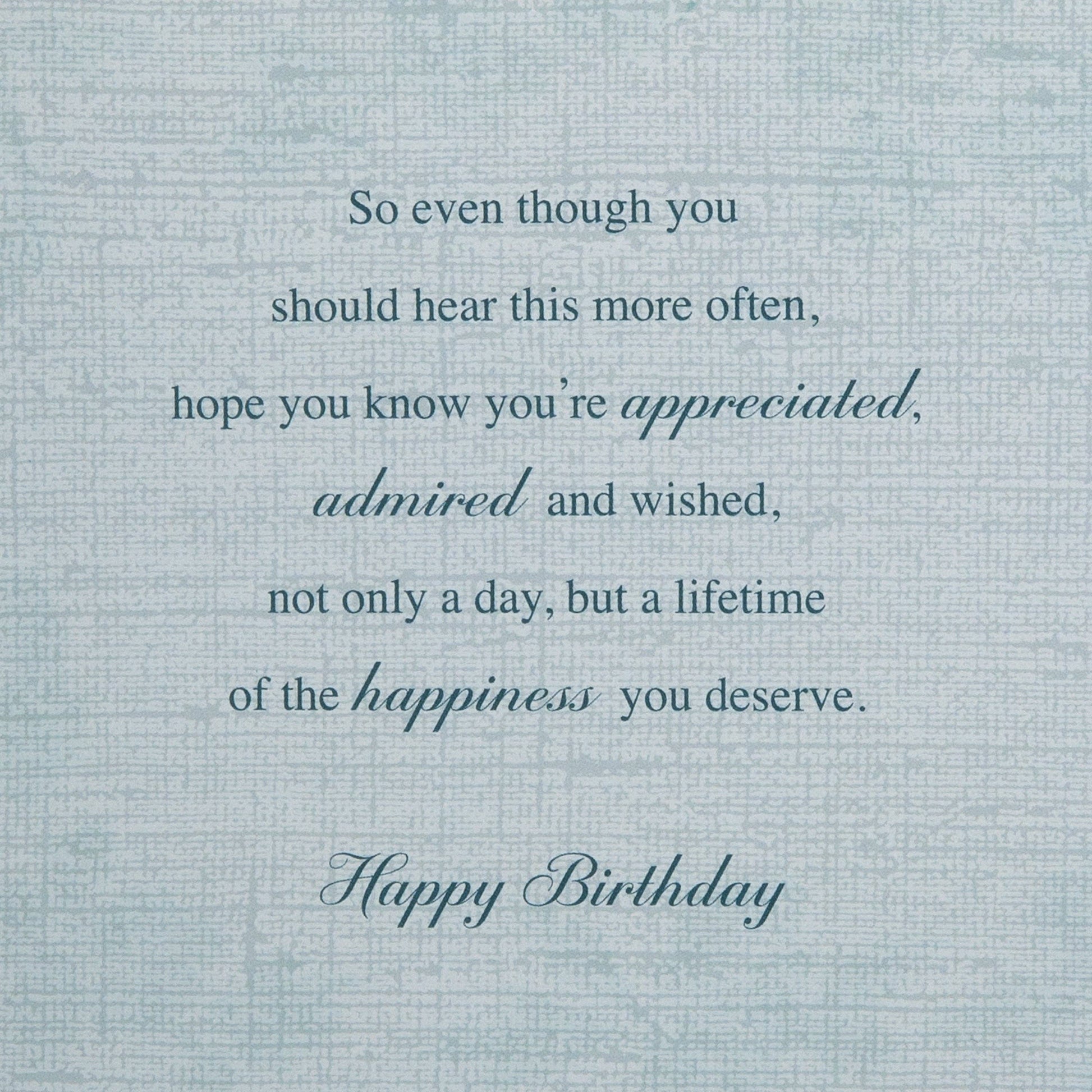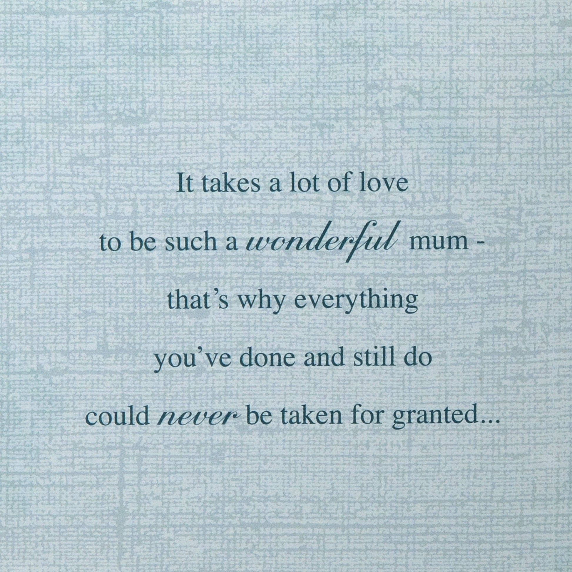 Message Inside Reads: It takes a lot of love to be such a wonderful mum - that's why everything you've done and still do could never be taken for granted… So even though you should hear this more often, hope you know you're appreciated, admired and wished, not only a day, but a lifetime of the happiness you deserve. Happy Birthday
