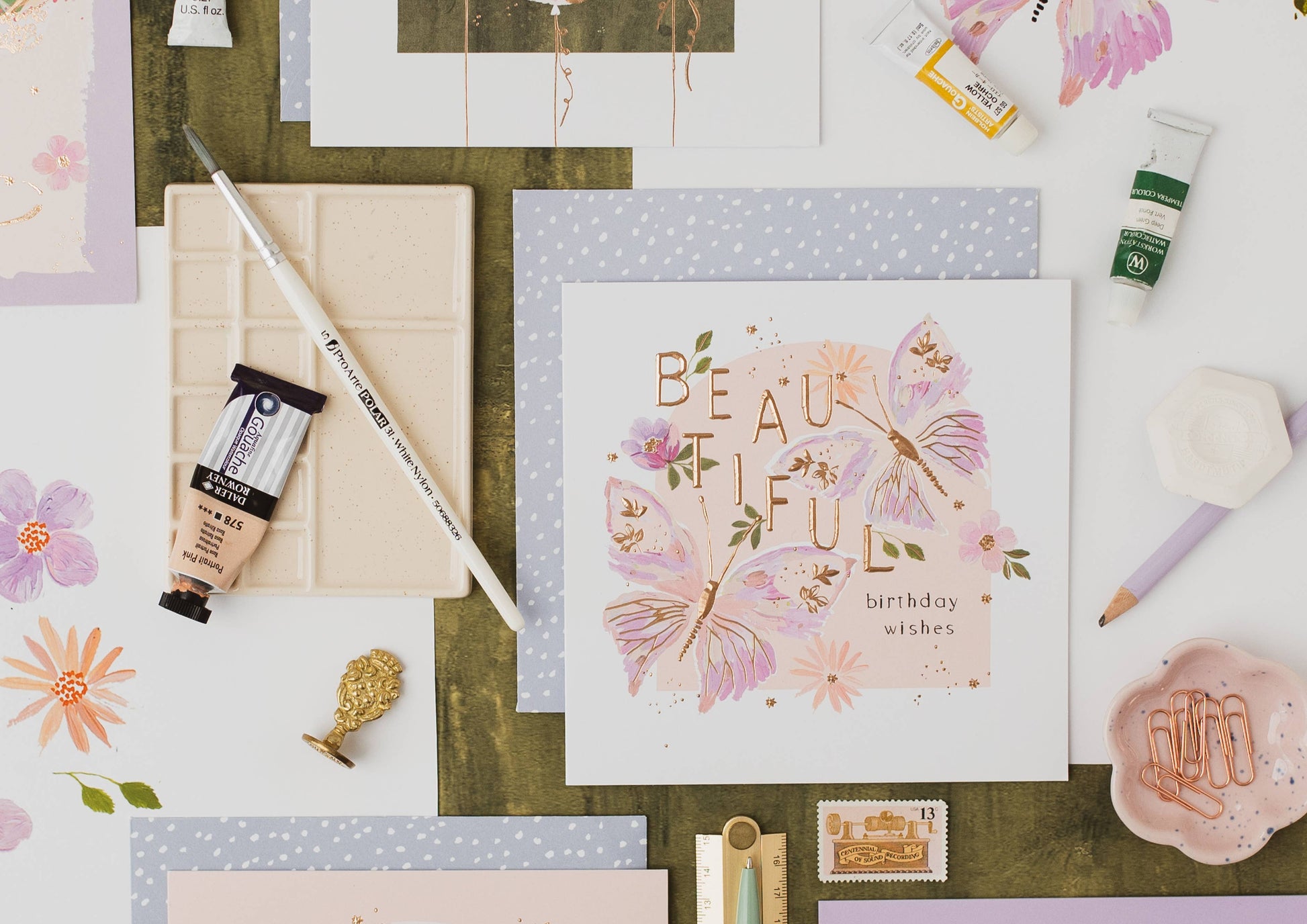 Perfectly pretty, Botanique is filled with hand-painted flowers, beautiful butterflies, botanical foliage and delicate linework. Scattered touches and oversized lettering in geo-fluted rose gold foil adds another gorgeous dimension to these stunning designs. Paired with a bespoke dotty envelope.
