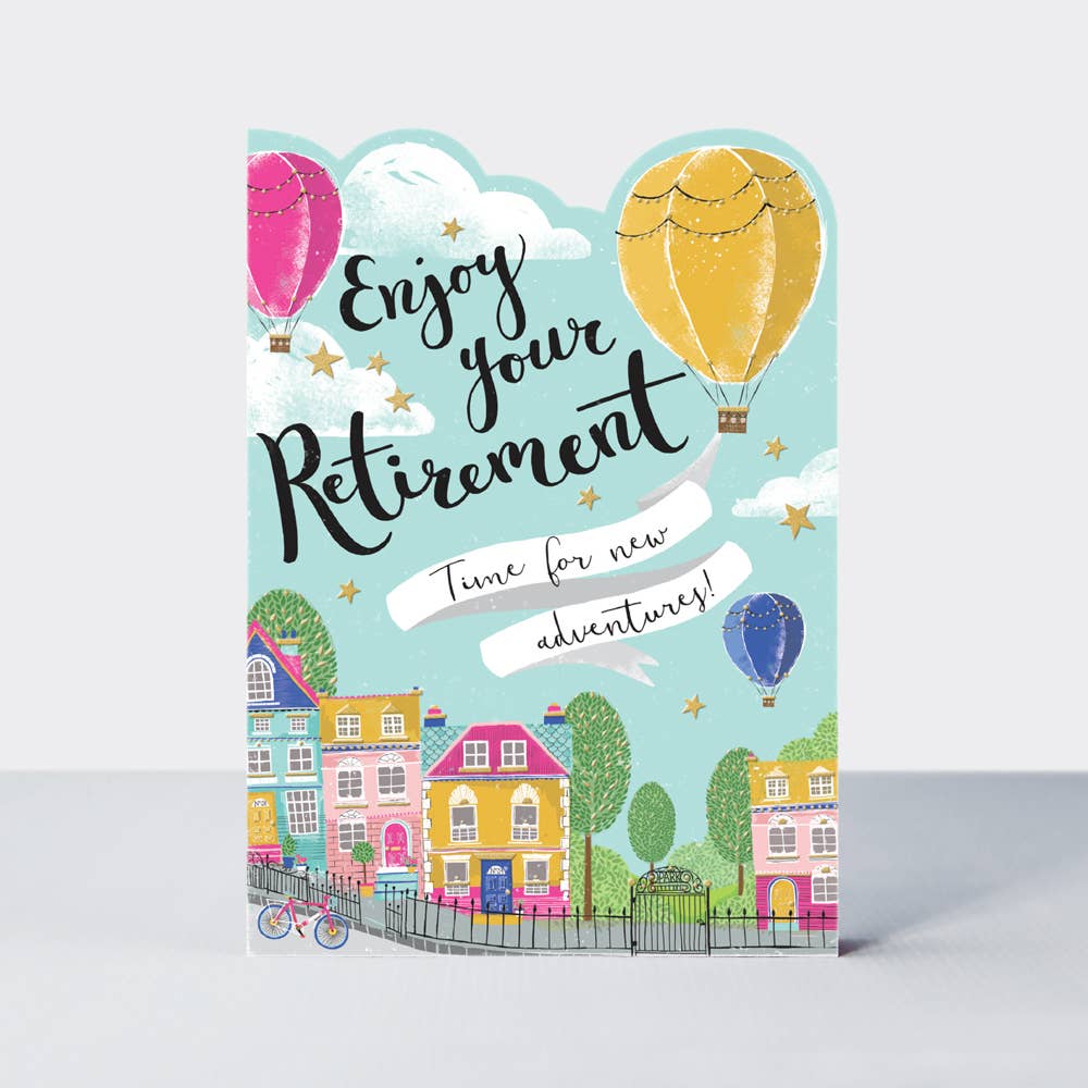 A bright and cheerful retirement card featuring a die-cut shaped top, textured board, and beautiful gold foiling. Perfectly finished with a zingy envelope!