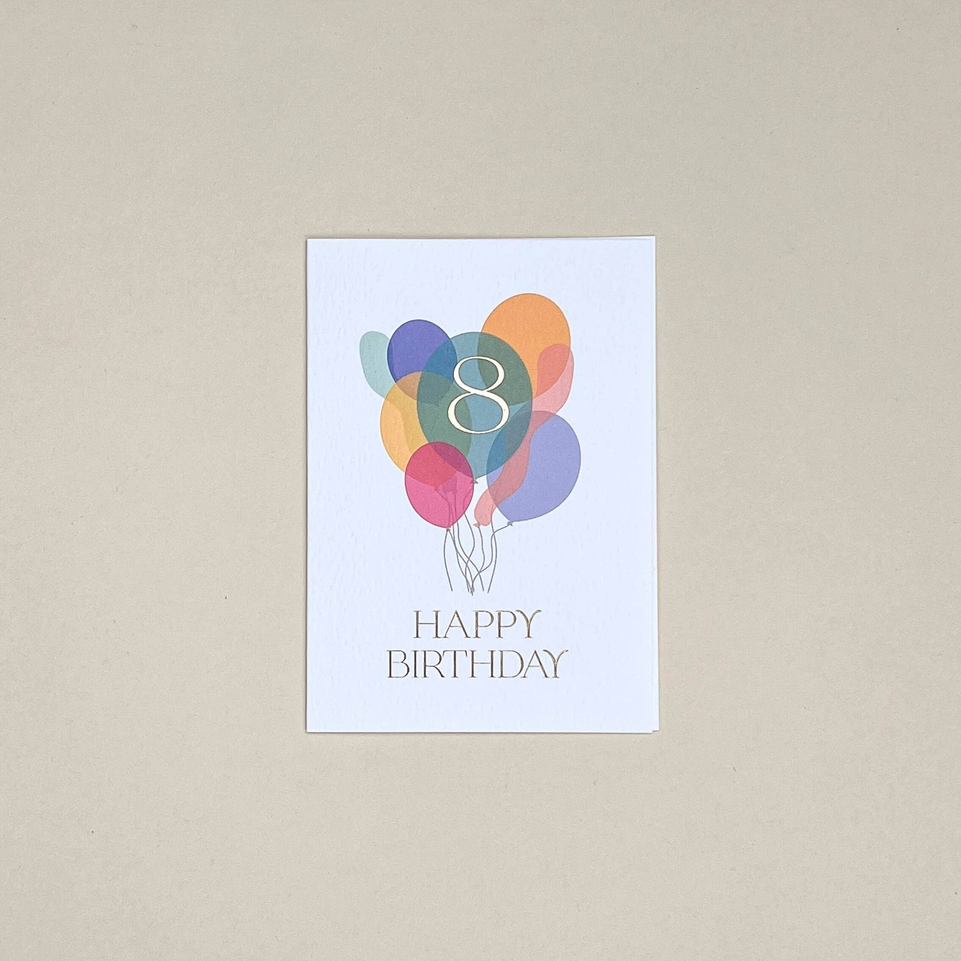 Luxury eighth birthday balloon greetings card, featuring an illustration of eight coloured balloons with the number 8 and the words ‘Happy Birthday' in gold foil. Each hot foil card has been printed individually on my traditional hot foil press in my Cambridgeshire Studio using premium uncoated card stock and luxurious foil. This greetings card is A6 in size and comes with a crisp white envelope with a tactile finish which oozes quality when it comes through the letterbox.