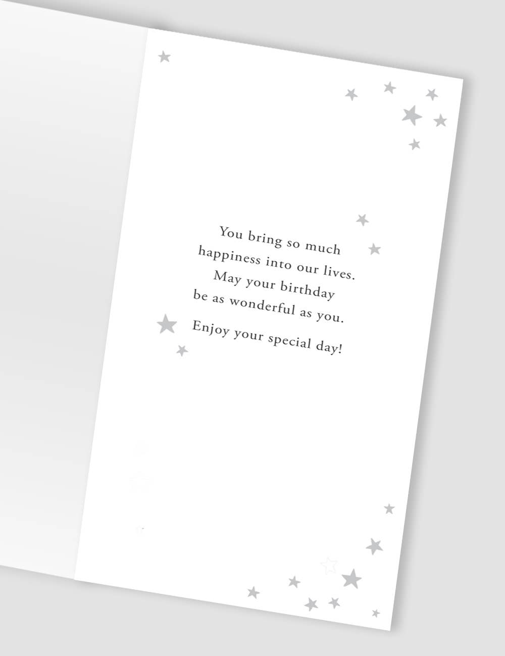 Message Inside Reads: You bring so much happiness into our lives. May your birthday be as wonderful as you. Enjoy your special day!