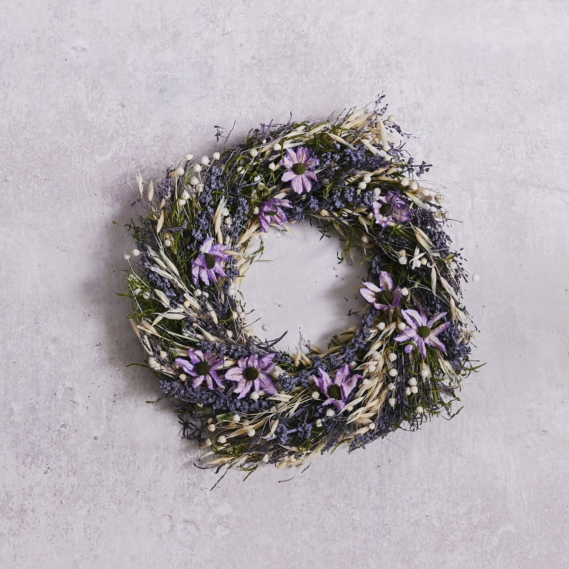 A purple dried floral wreath from Bloom by HESTIA®. This beautiful wreath provides a desirable sample of nature for display in homes. The affectionately arranged dried flower wreath showcases a selection of choice purple and white varieties mixed with foliage. It is designed for wall display using the attached rope hanger. The wreath is packaged in a cardboard tray.