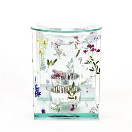 Bring some sweet harmonious sentiment to the home with this wildflower print glass oil burner. Details: - Clear glass oil burner - Beautiful wildflower pattern on the glass - Mirror back panel for light dispersal - Heat resistant oil bowl - 1 x tealight holder cup - Perfect perched on a shelf or mantel - Part of a collectable matching range