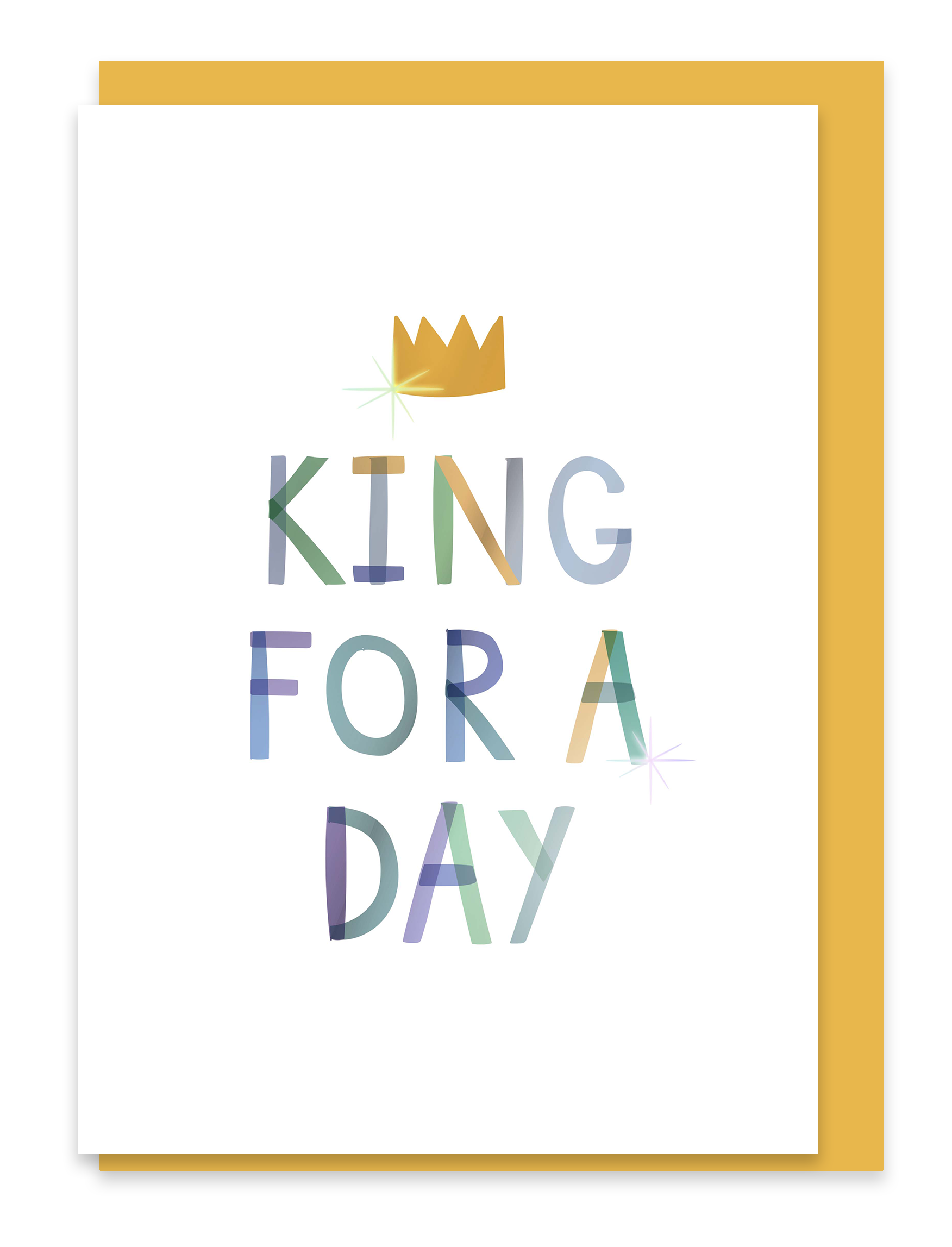A brilliantly bright greeting card, this card reads ‘King for a Day’, and is made with my hand-drawn typography, finished in a brilliantly shiny dig-foil, with a colour overlay in greens, blues and yellows. Perfect for people of all ages.