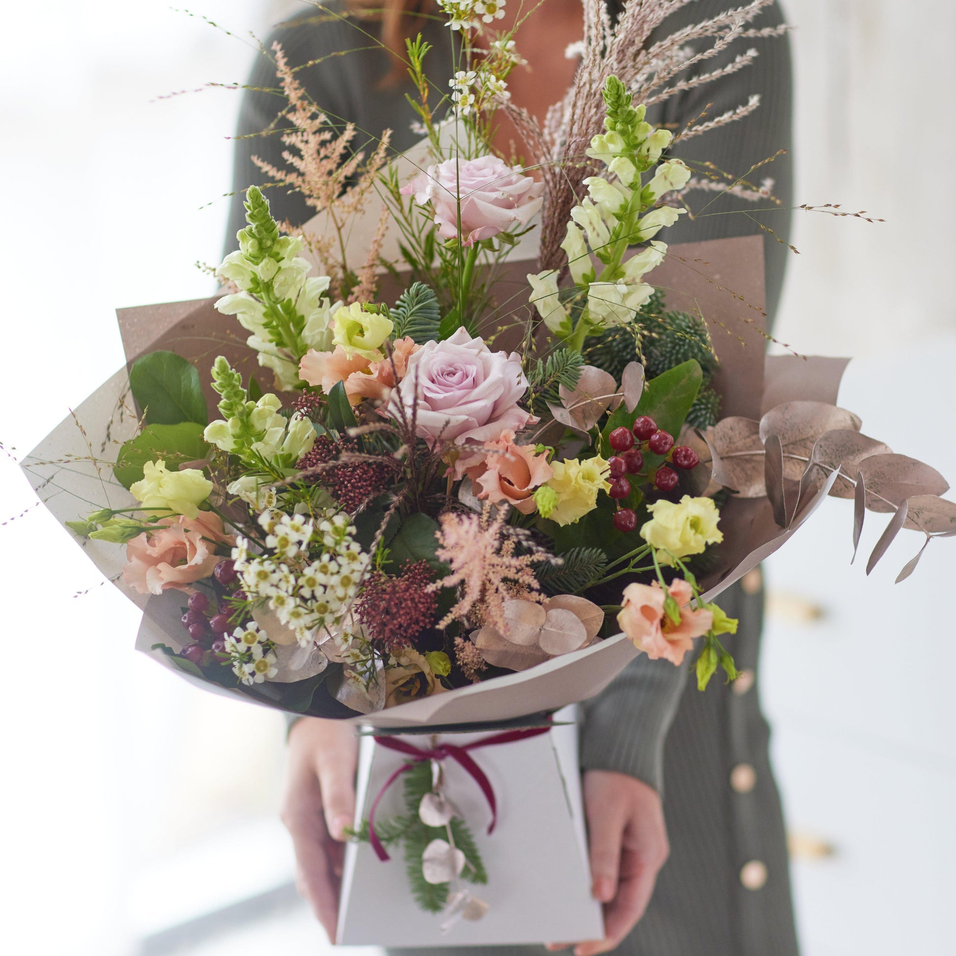 A glorious festive bouquet, arranged with love and care by their local florist. Bespoke and beautiful.