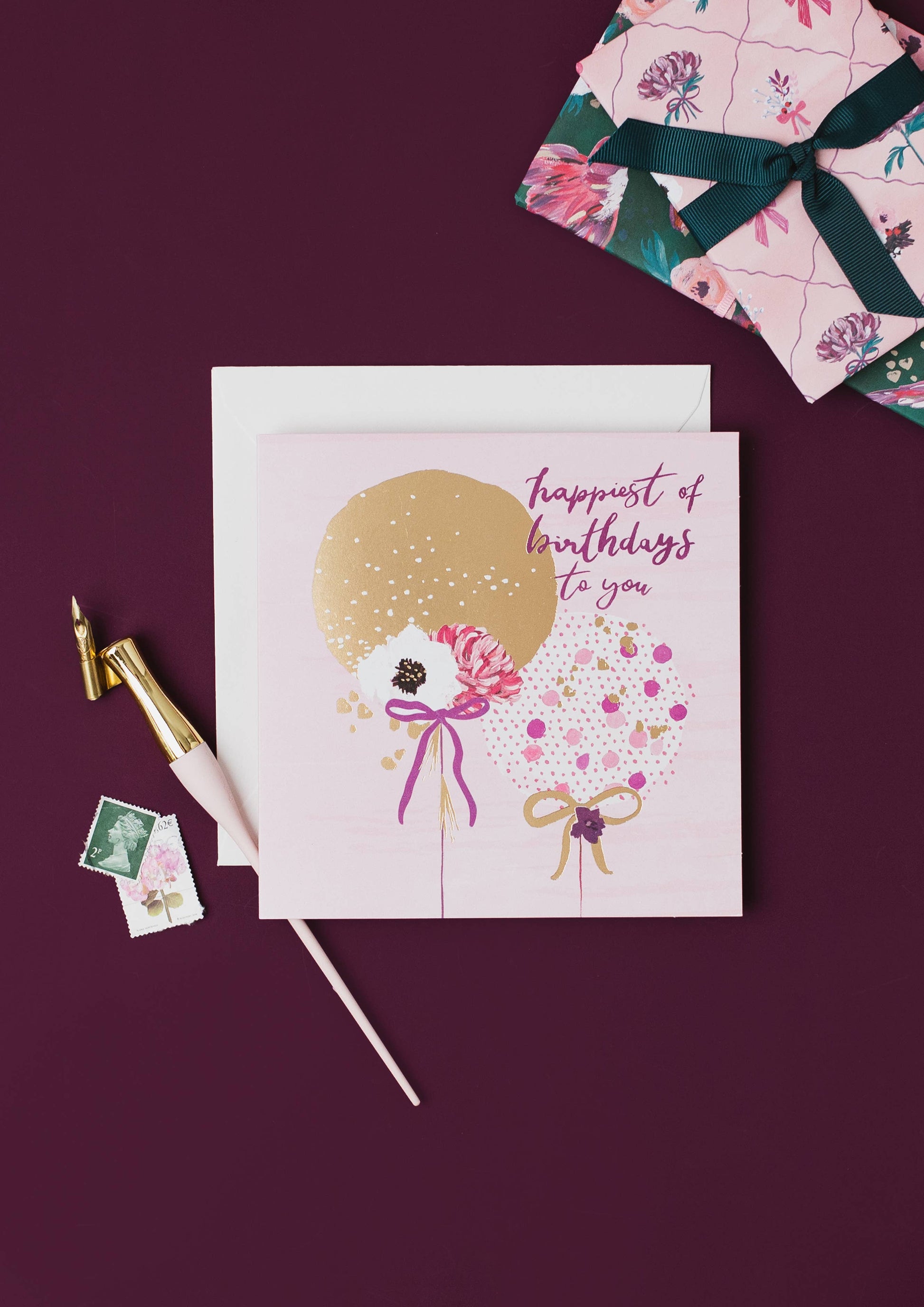 Beautifully painted, this stunning and dreamy collection captures beauty in nature and brings it into your home. Deep mulberry, forest green, dark teal and light pinks are paired with soft satin gold foil. Each card is complimented with a luxury, heavy-weight envelope, perfect for special birthdays.
