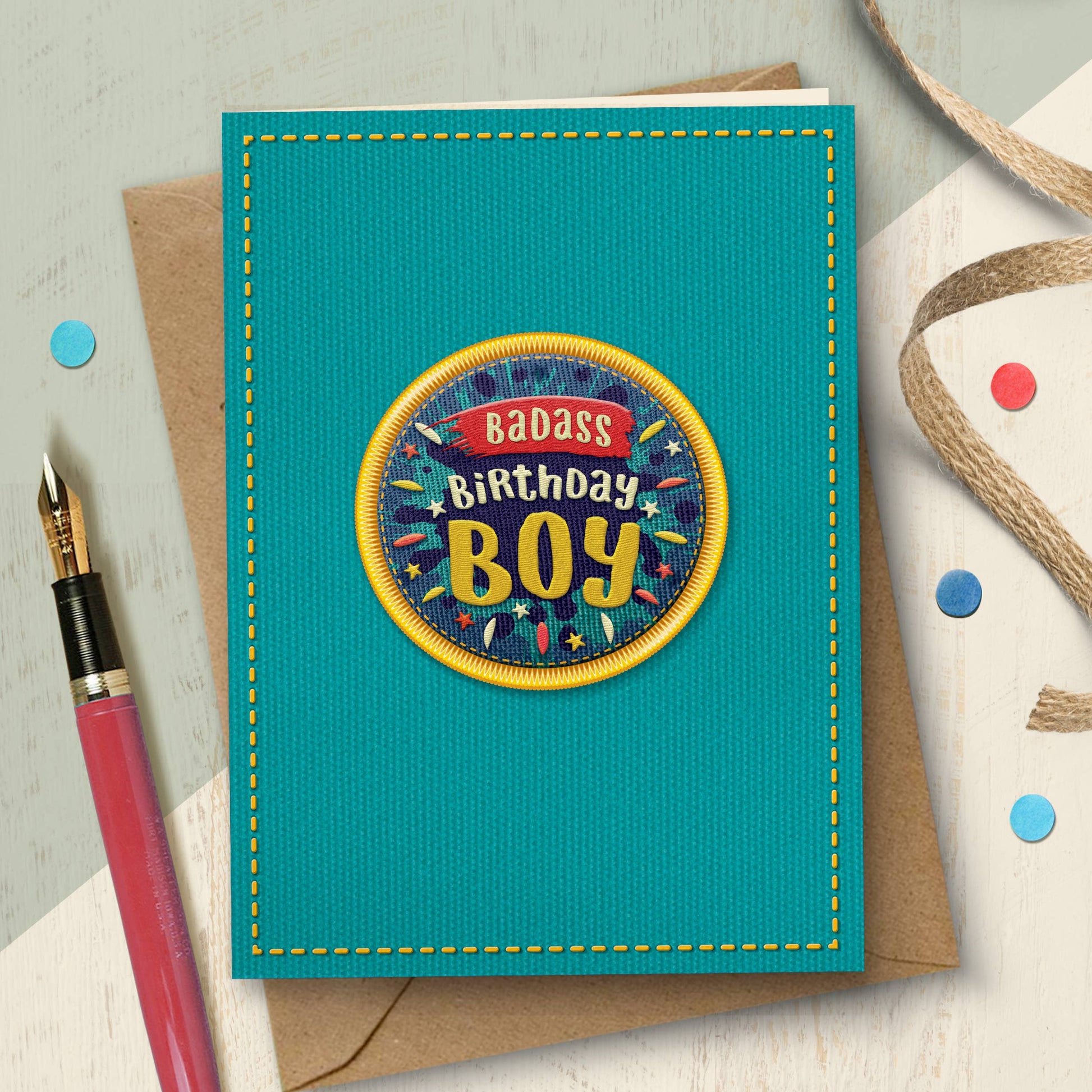A fun, illustrated patch badge birthday card for a badass birthday boy.