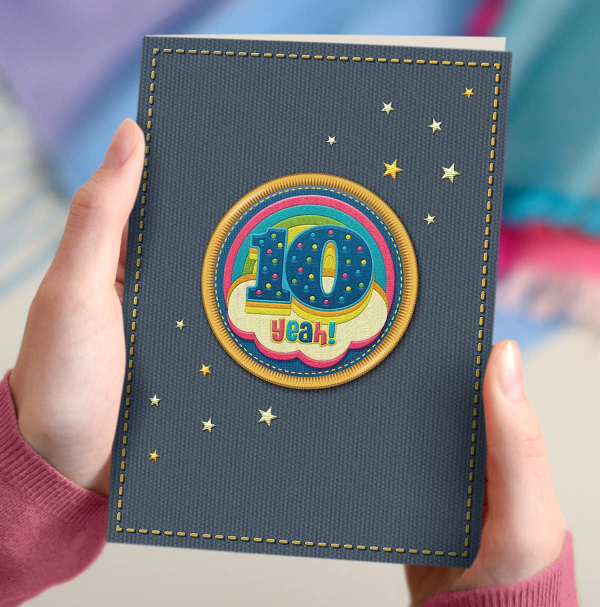 A fun, illustrated rainbow patch badge, age 10 birthday card.
