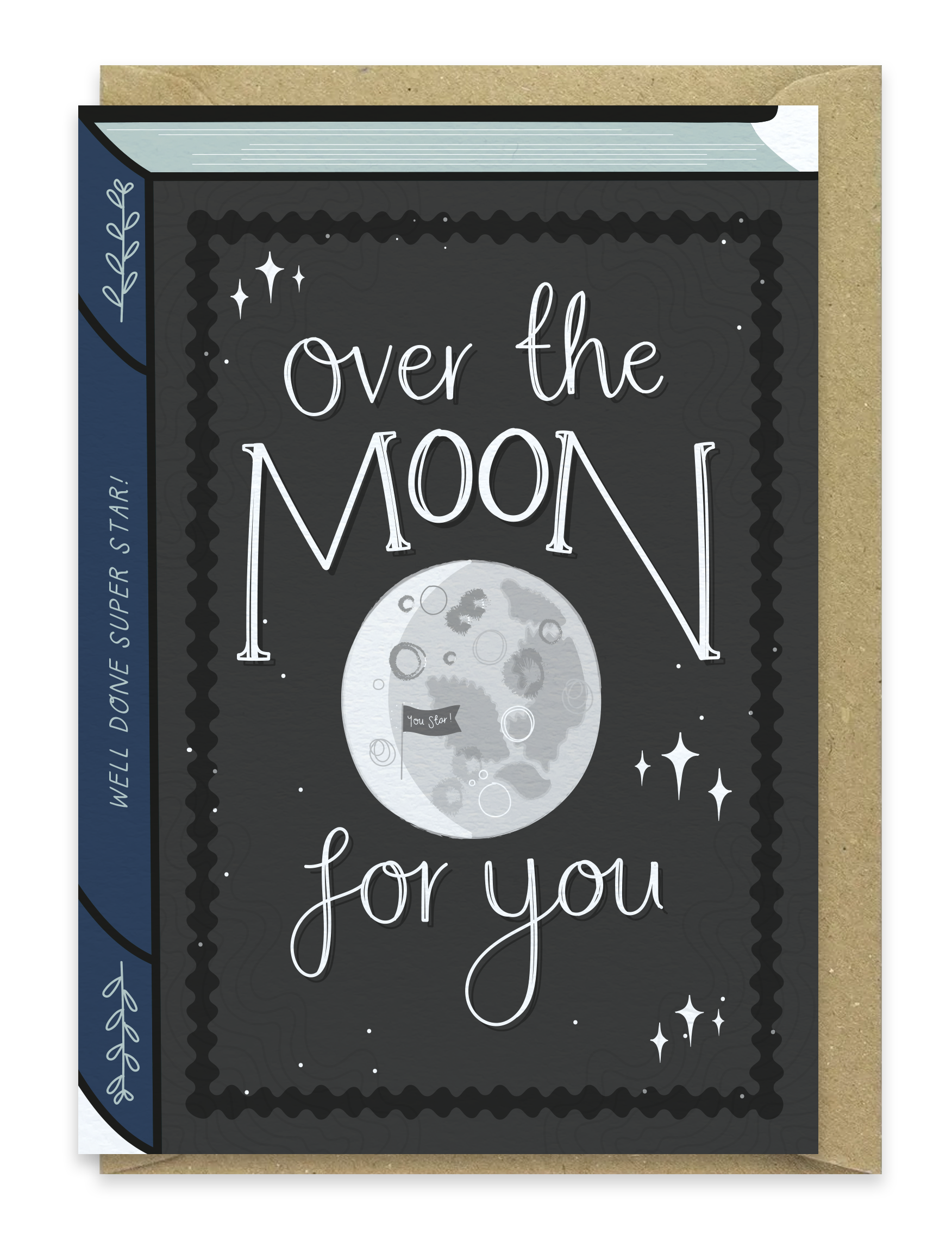 Inspired by the beauty of classic book covers, this book style greeting card features a bookish greeting ‘Over the Moon for you’ – centred around an illustration of our Moon. It is designed in a deep space Gray colour palette, with a few little scattered stars. It is gender neutral in design, and the spine reads ‘Well done super star , for an added Bookish touch.