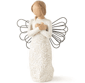Willow Tree is an intimate line of figurative sculpture that speaks in quiet ways to heal, comfort, protect and inspire. Artist Susan Lordi hand carves each original Willow Tree sculpture. This piece is cast from her original carving, and then painted by hand. The figurine features an angel with a little gold heart. This piece is all about memories: how warm, comforting memories help us to heal when we're missing someone. If you look closely at the carved icons on her dress.