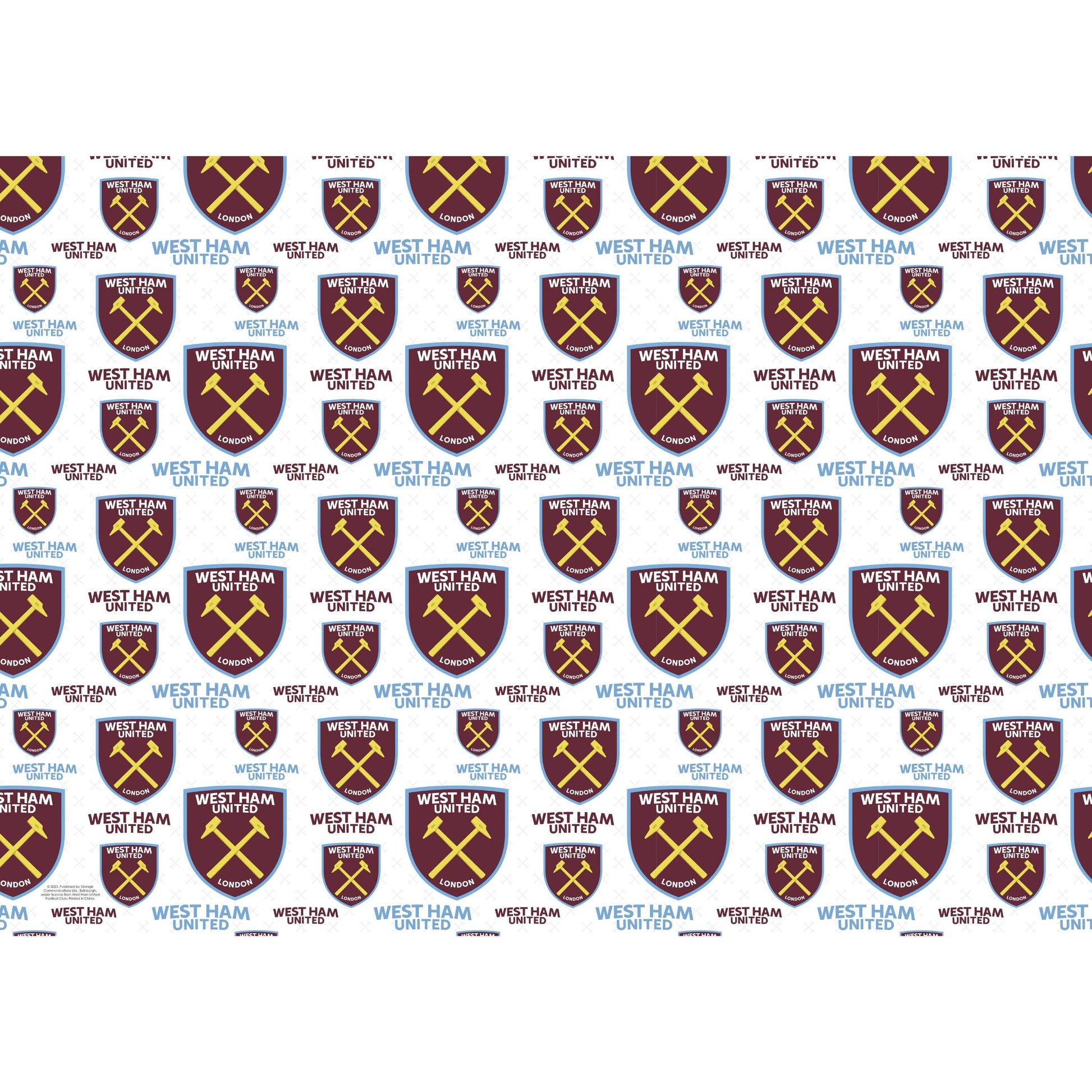 This pack of two sheets of gift wrap has the West Ham Football Club Crest repeated across it in various sizes. West Ham United is also written across the light background.